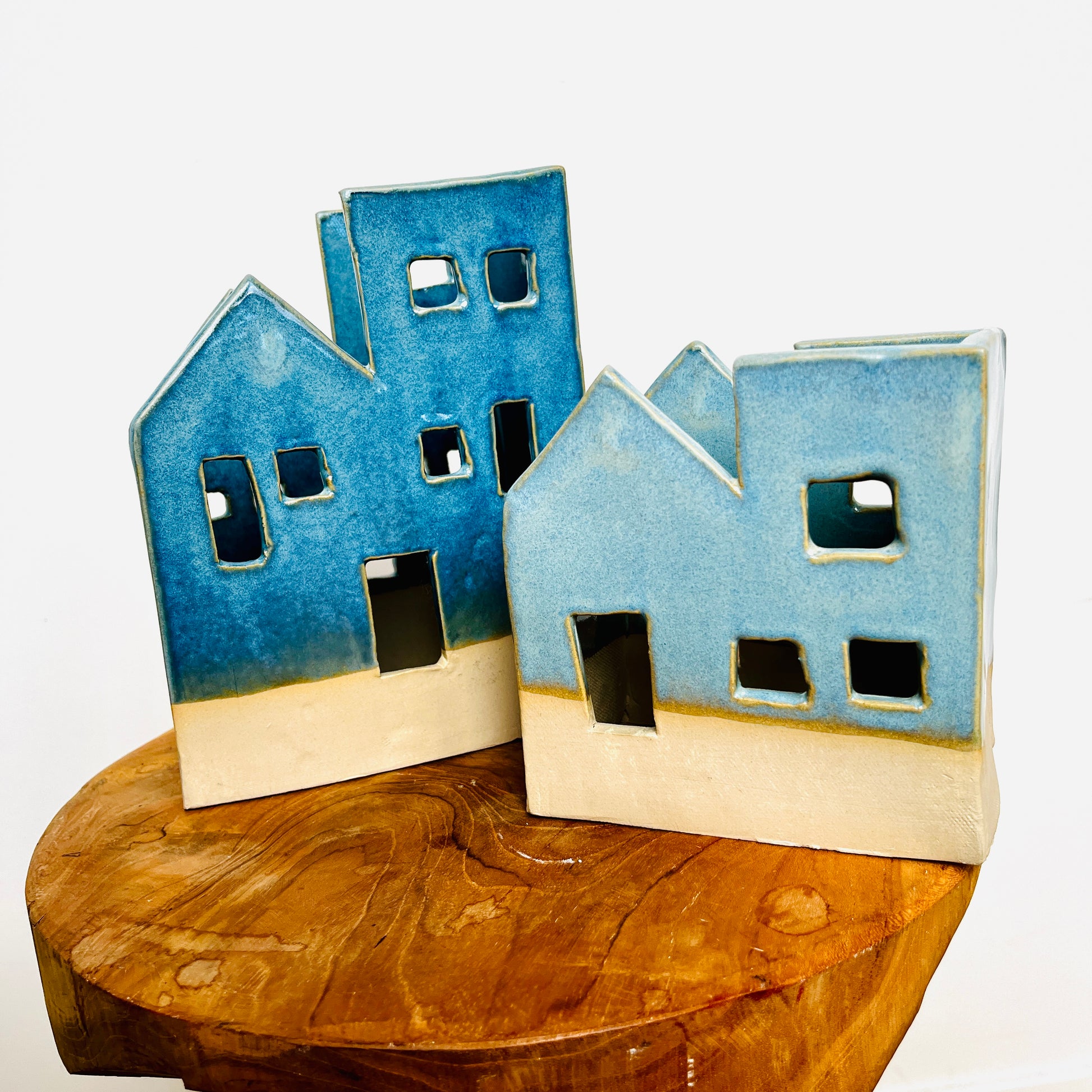 Handgemaakte keramieken huisjes om een theelichtje in te plaatsen.