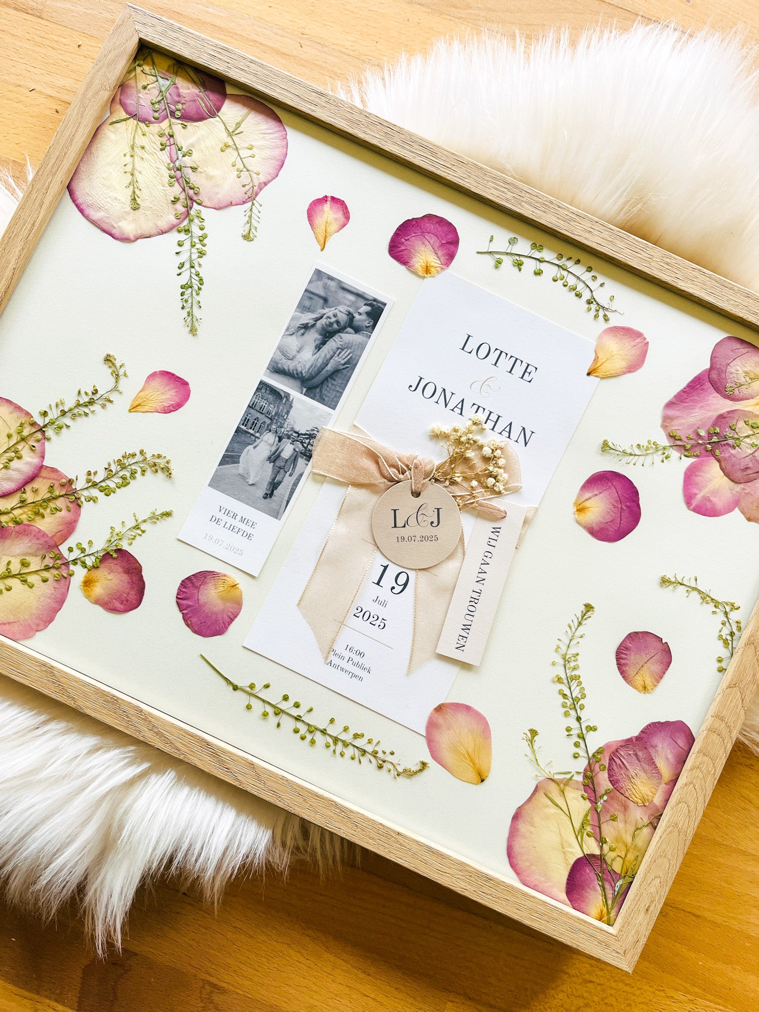 We bespreken eerst via mail of het mogelijk is je boeket te persen en hoe je dit afgewerkt wil zien.